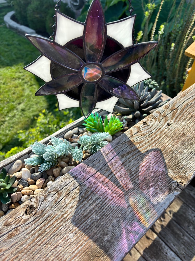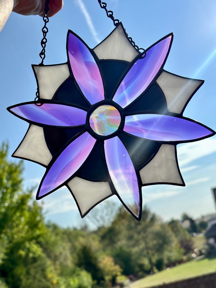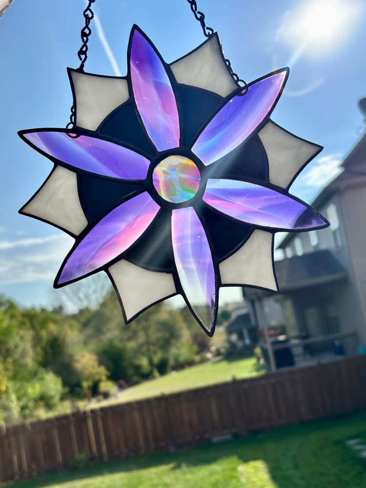 Handblown Fremont Glass and a Dichroic Center, this flower sunburst is INCREDIBLE!!! The colors in this glass are over the top and one of a kind.