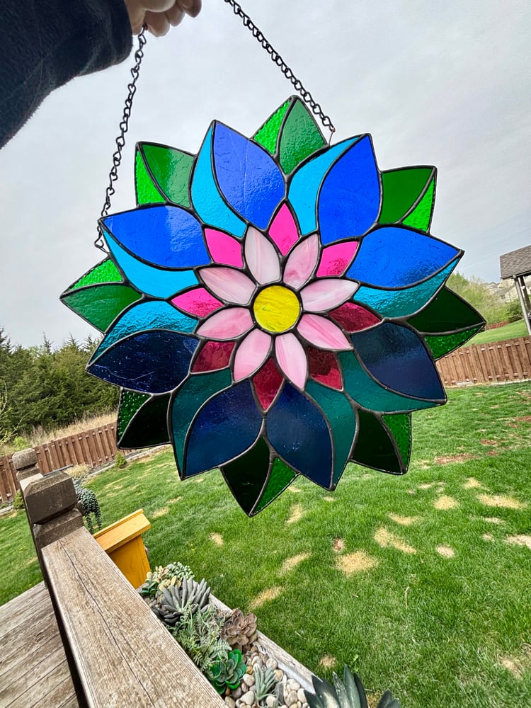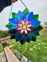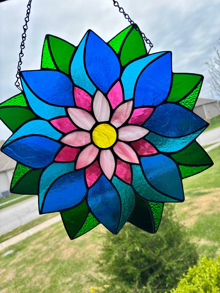A breathtaking stained-glass flower mandala crafted with layered petals in deep blues, bright greens, pearly pinks, and glowing yellow center. With its bold size and radiant colors, it fills any window with brilliant light and stunning details. Perfect for meditation spaces, sunrooms, entryways, studios, nature-inspired decor, or anyone who loves bold, large, handcrafted art.