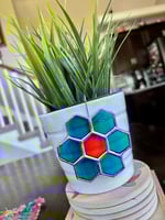 Add a pop of color to your plants with this handmade stained-glass planter hanger. Designed in a hexagon flower pattern (aka Honeycomb) in multiple color palettes. Each piece hangs from a sturdy metal hook that easily slips over planter edges. A perfect mini decor accent for houseplants, desks or as a colorful gift for plant lovers who enjoy handmade art.